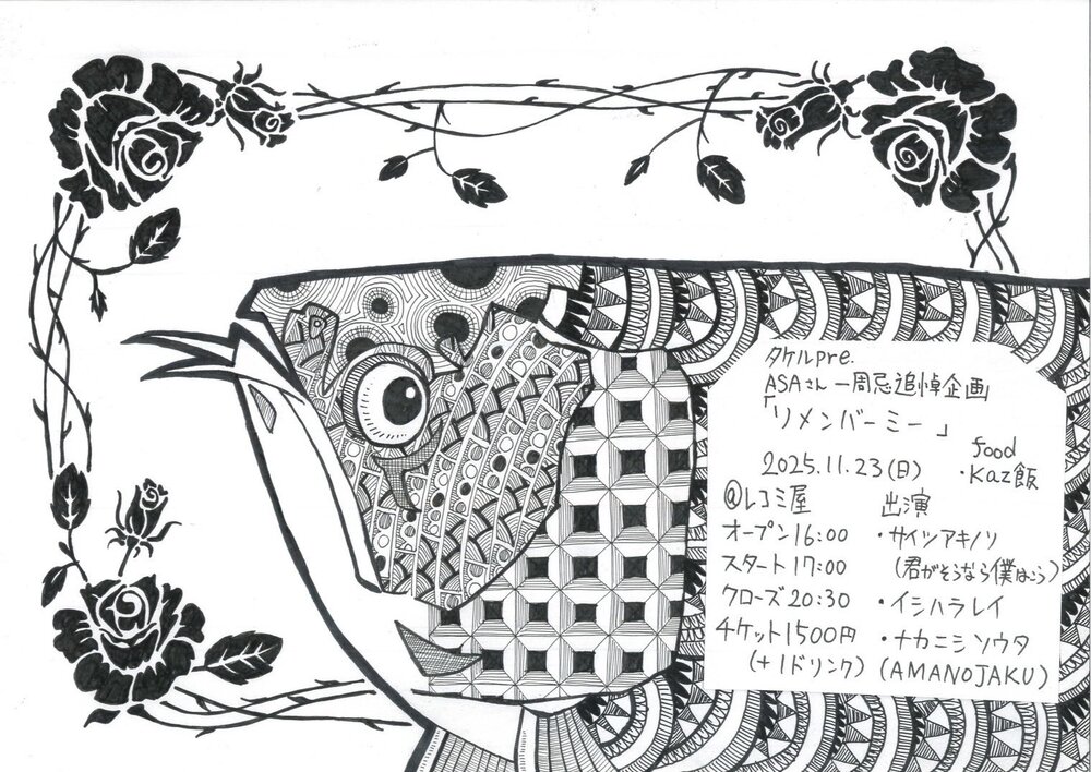 タケルpre.ASAさん一周忌追悼企画「リメンバーミー」(ソロ出演) LIVE 2025/11/23(日) 16:00 - サイツの出演は18:30〜です。 チケット取り置きはHPのコンタクトからお願いします。 URLをコピーする 報告する