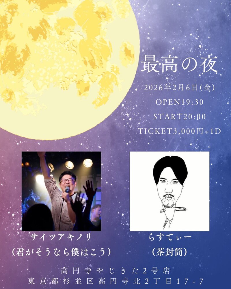 (東京)「最高の夜」(サイツソロ) LIVE 2026/02/06(金) 19:00 - 出演者、出演時間 19:30オープン 20:00らすてぃー(茶封筒) 21:00サイツアキノリ(君がそうなら僕はこう) 【チケット代金】 3,000円+1d 【場所】 高円寺やじきた2号店 チケットはコンタクトから取り置きしてください。 URLをコピーする 報告する
