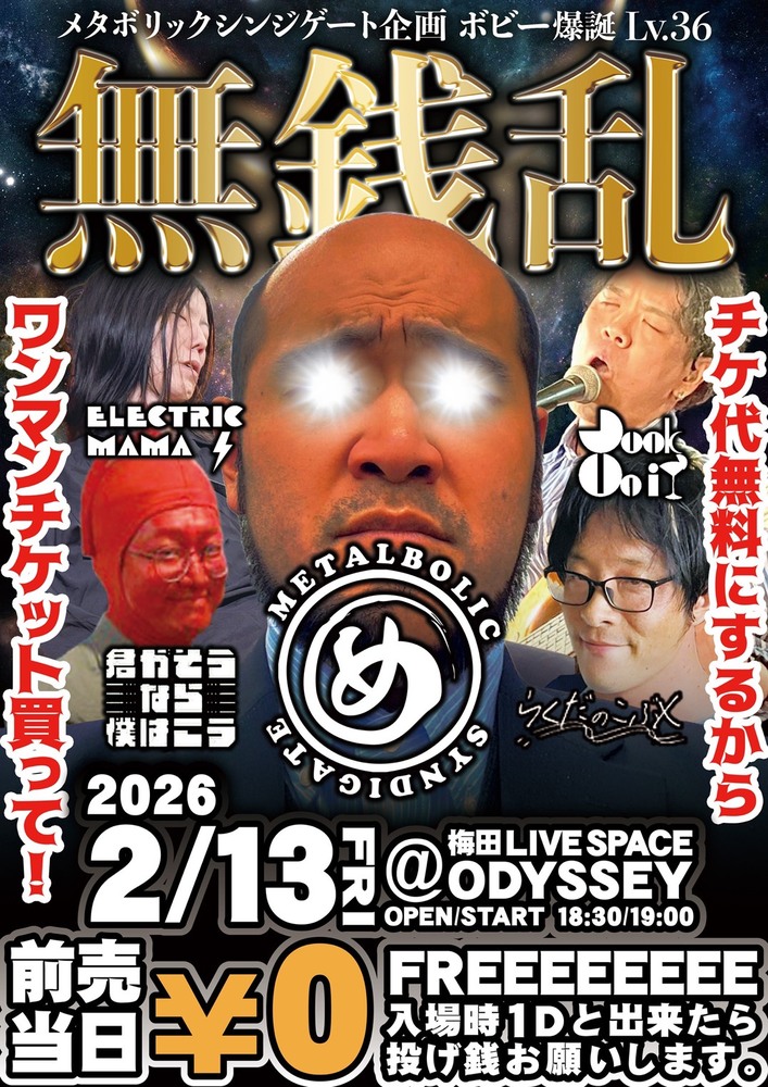 メタボリックシンジゲート企画 ボビー爆誕Lv.36「無銭乱」 LIVE 2026/02/13(金) 18:30 - 梅田LIVESPACE ODYSSEY 地図を表示 チケット代無料!(入場時1ドリンクお願いします。) OPEN18:30 START19:30 【出演】 メタボリックシンジゲート 君がそうなら僕はこう らくだのこぶX ELECTRICl MAMA JUNK UNIT 予約はこちら URLをコピーする 報告する