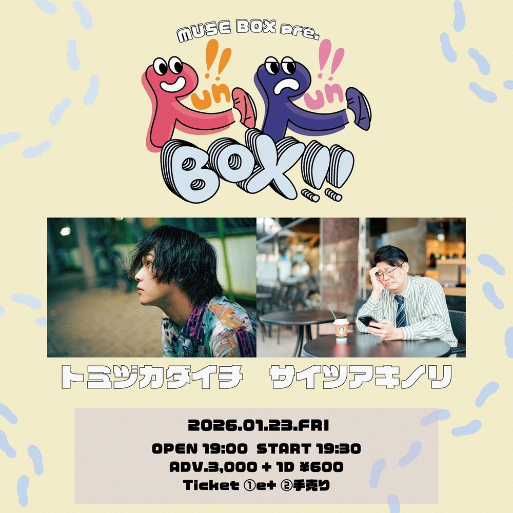 Run!!Run!!BOX!!(サイツソロ) LIVE 2026/01/23(金) 19:30 - MUSE BOX 地図を表示 MUSE BOX pre. Run!!Run!!BOX!! 出演 トミヅカダイチ サイツアキノリ(出演は19:30~) 開場 19:00/ 開演 19:30 チケットはこちら URLをコピーする 報告する