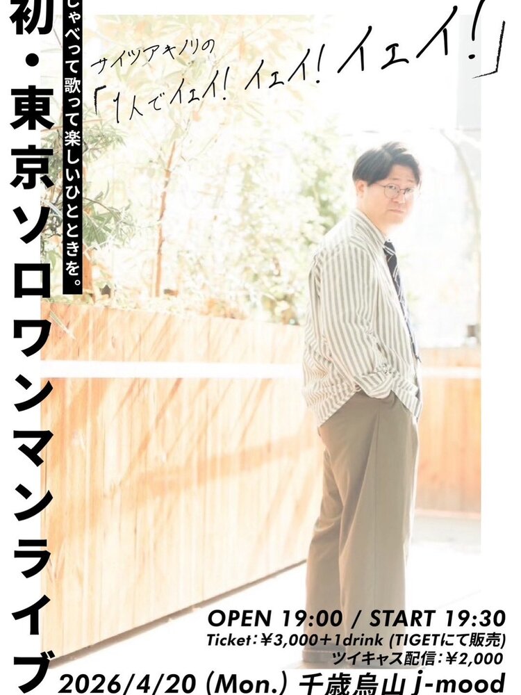 【ソールドアウト】『サイツアキノリの1人でイェイ!イェイ!イェイ!』(ソロ) LIVE 2026/04/20(月) 19:00 - 千歳烏山j-mood 地図を表示 有観客チケットはソールドアウトしましたが 配信チケットがあります! サイツの初東京ソロワンマン、ぜひご覧ください! 配信チケット URLをコピーする 報告する