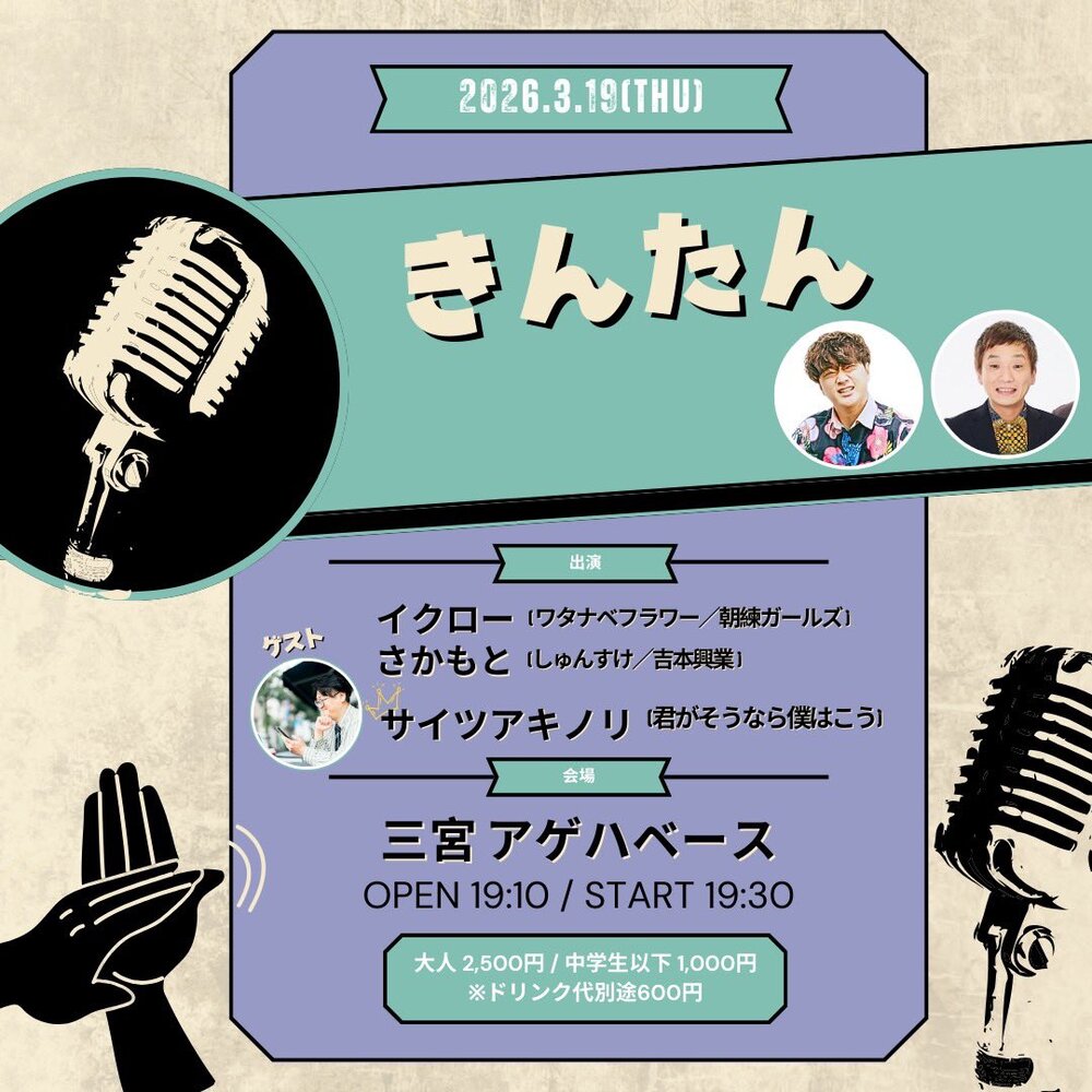 (神戸)きんたん(ソロ) LIVE 2026/03/19(木) 19:10 - 三宮アゲハベース 地図を表示 standFMのラジオ 「ちゃぱきんたんぱん」の イベント 歌とトークとコーナーです! ゲストで出演させて頂きます! チケットこちら URLをコピーする 報告する